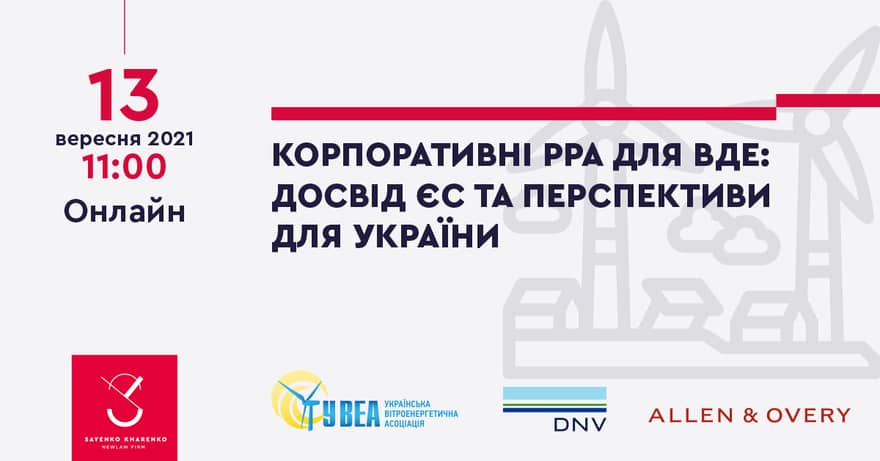 Саме тому 13 вересня 2021 року Українська вітроенергетична асоціація (УВЕА) спільно з Sayenko Kharenko проводять міжнародний вебінар, присвячений питанням корпоративних PPA на постачання «зеленої» електроенергії. Під час вебінару буде представлений досвід Польщі, Німеччини та інших країн ЄС, розглянуті необхідні зміни до українського законодавства щодо ефективного впровадження корпоративних PPA.